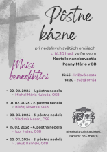 Počas tohtoročného Pôstu budú nedeľnými kazateľmi v našej farnosti mnísi benediktíni. Pôstne kázne zaznejú pri nedeľných svätých omšiach o 16.30 hod. vo farskom Kostole nanebovzatia Panny Márie v Banskej Bystrici.