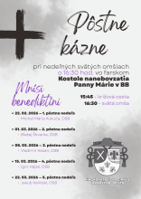 Počas tohtoročného Pôstneho obdobia budú nedeľnými kazateľmi v našej farnosti mnísi benediktíni. Pôstne kázne zaznejú pri nedeľných svätých omšiach o 16.30 hod. vo farskom Kostole nanebovzatia Panny Márie v Banskej Bystrici.